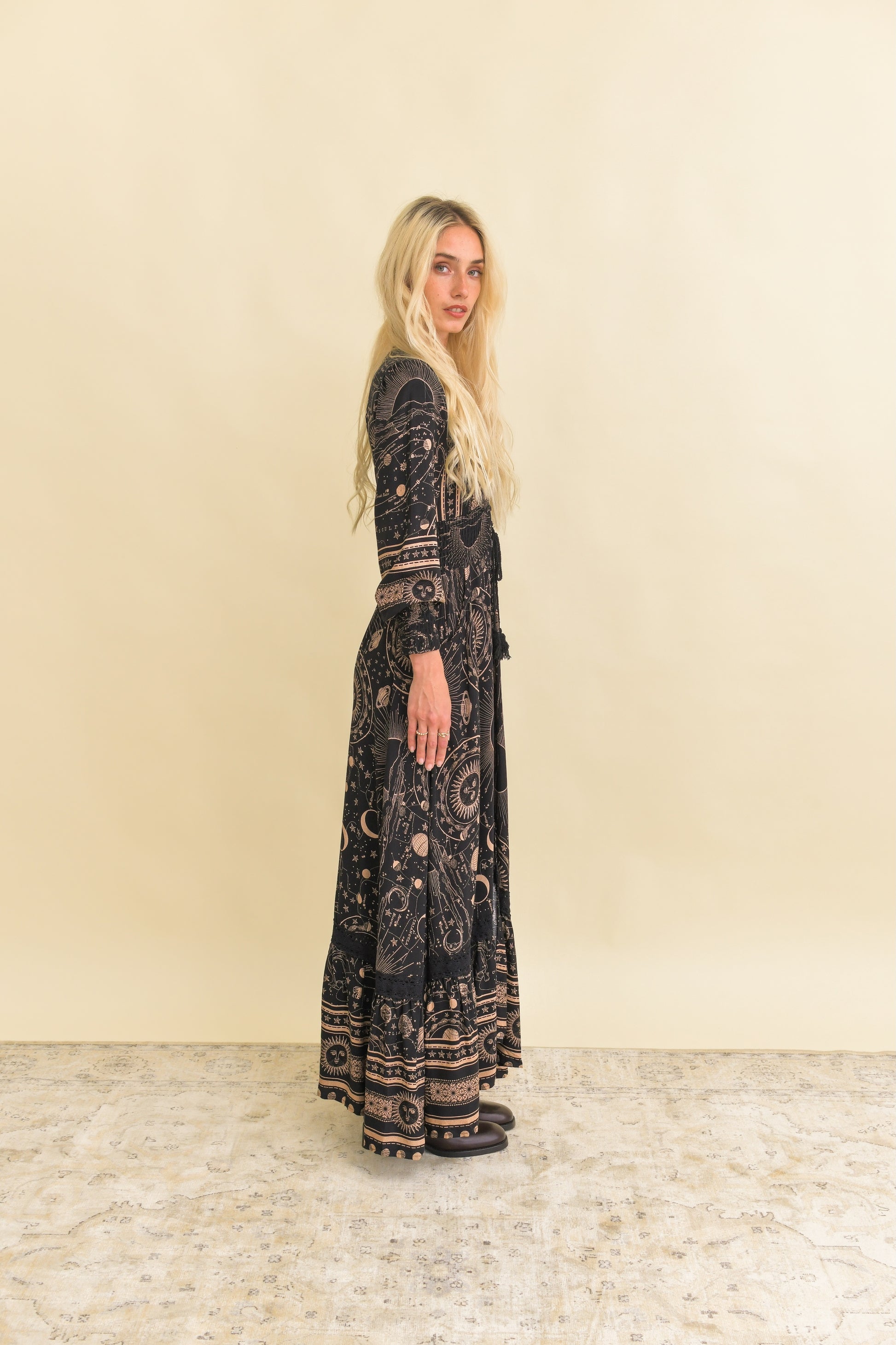 The Jaase Sabrina Maxi Dress has everything you could dream of. Designed with elegant long sleeves featuring shirred cuffs, a flattering fitted bodice, and a shirred waistline that beautifully defines your shape. The full button-through front allows you to wear it as a flowing maxi dress or effortlessly as a duster kimono. With delicate lace detailing above a frilled hem, this fit-and-flare silhouette captures the essence of carefree bohemian style and timeless femininity.