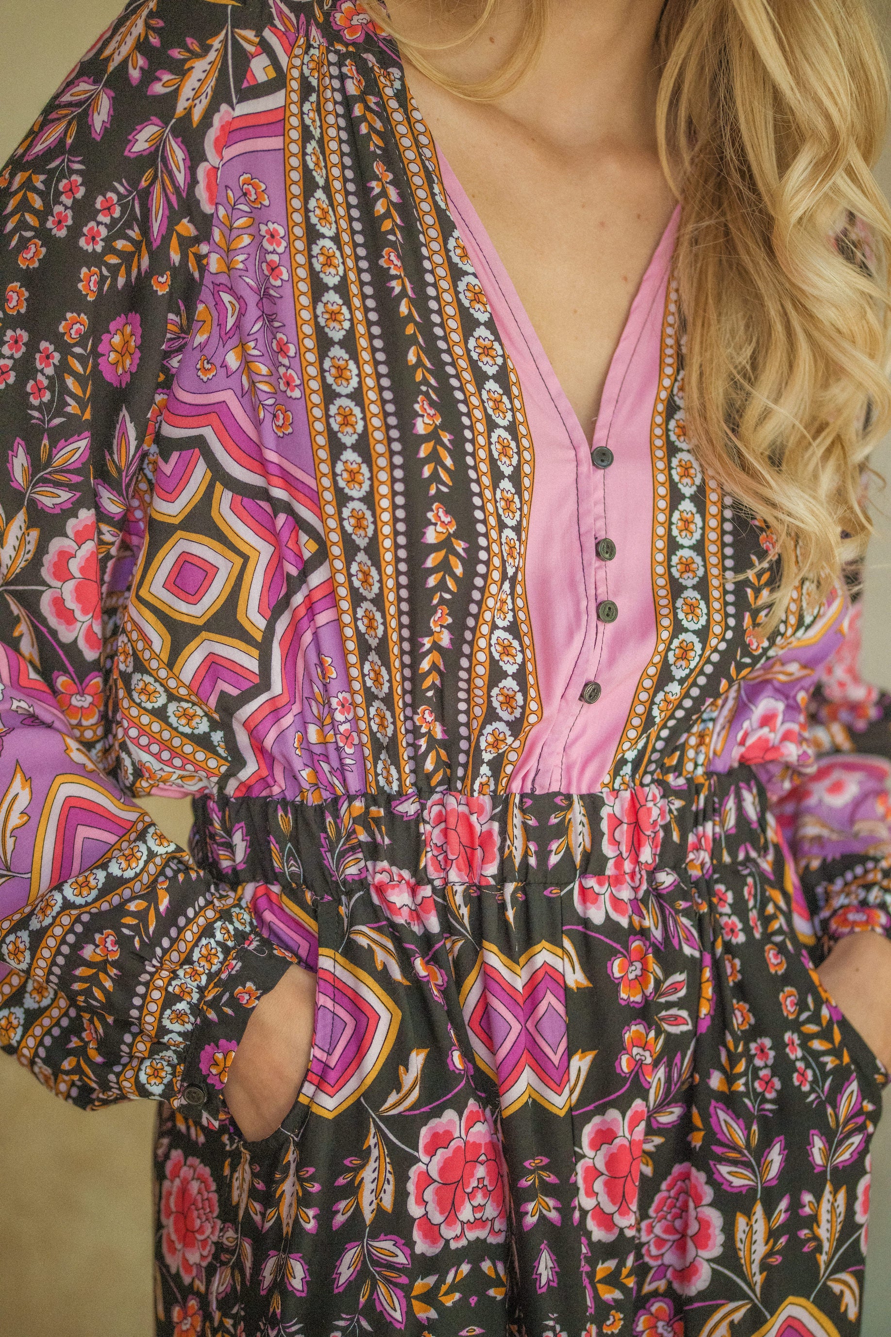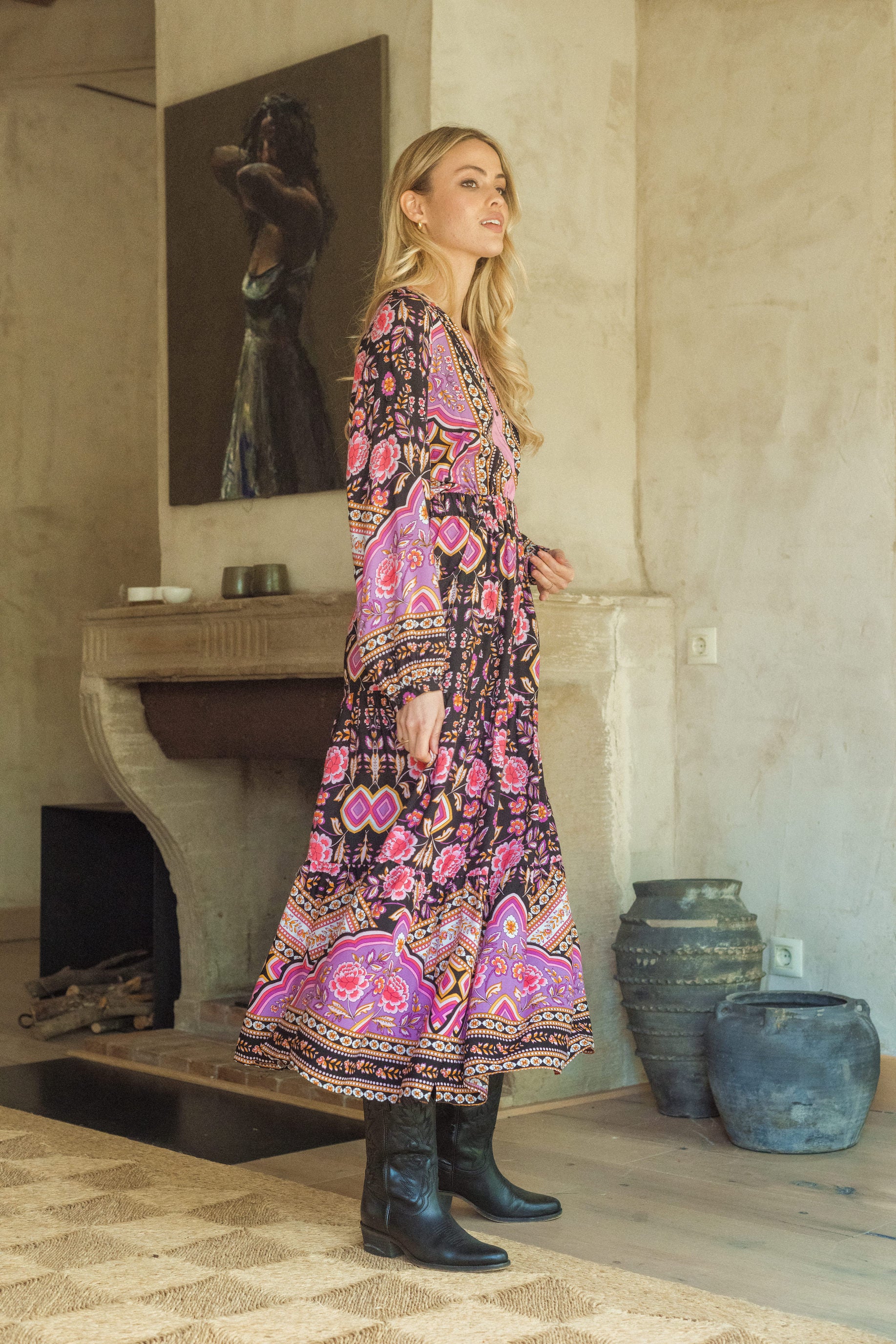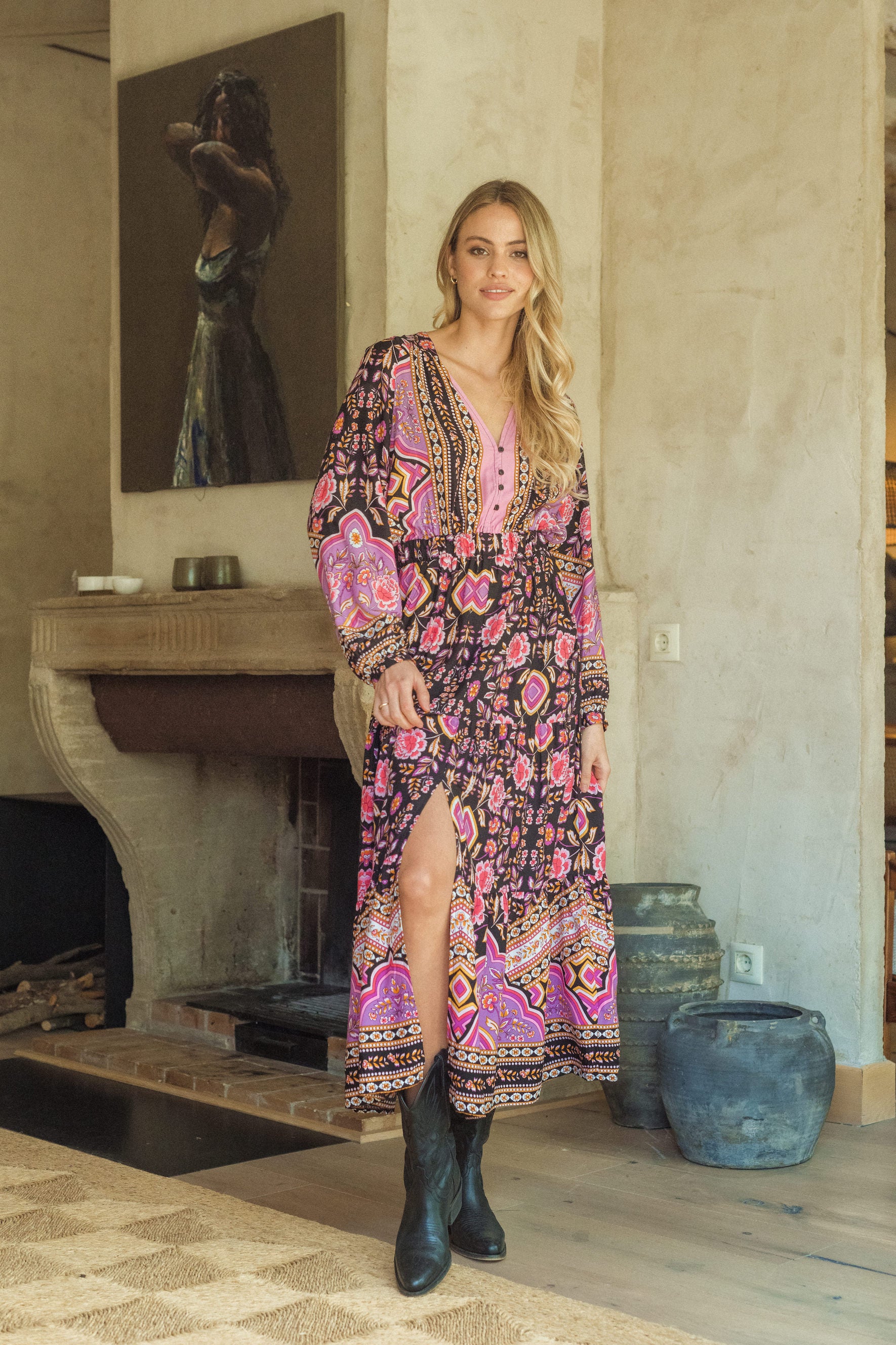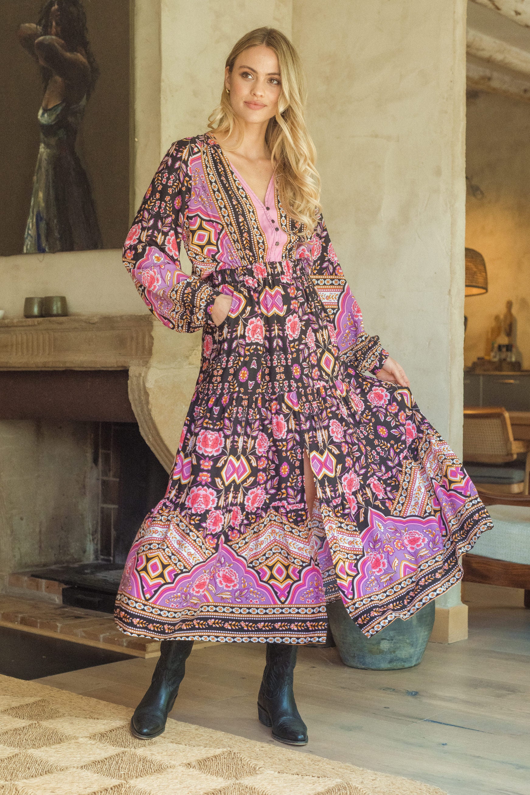 Este vestido largo de Jaase Chance presenta un favorecedor escote en V y un busto clásico con botones, complementados con elegantes mangas con puños para una transición perfecta del día a la noche. Un divertido dobladillo con volantes y una cómoda cintura elástica añaden detalles sofisticados y realzan la silueta. El elegante largo maxi alarga la figura, haciendo de este vestido una opción versátil y elegante.