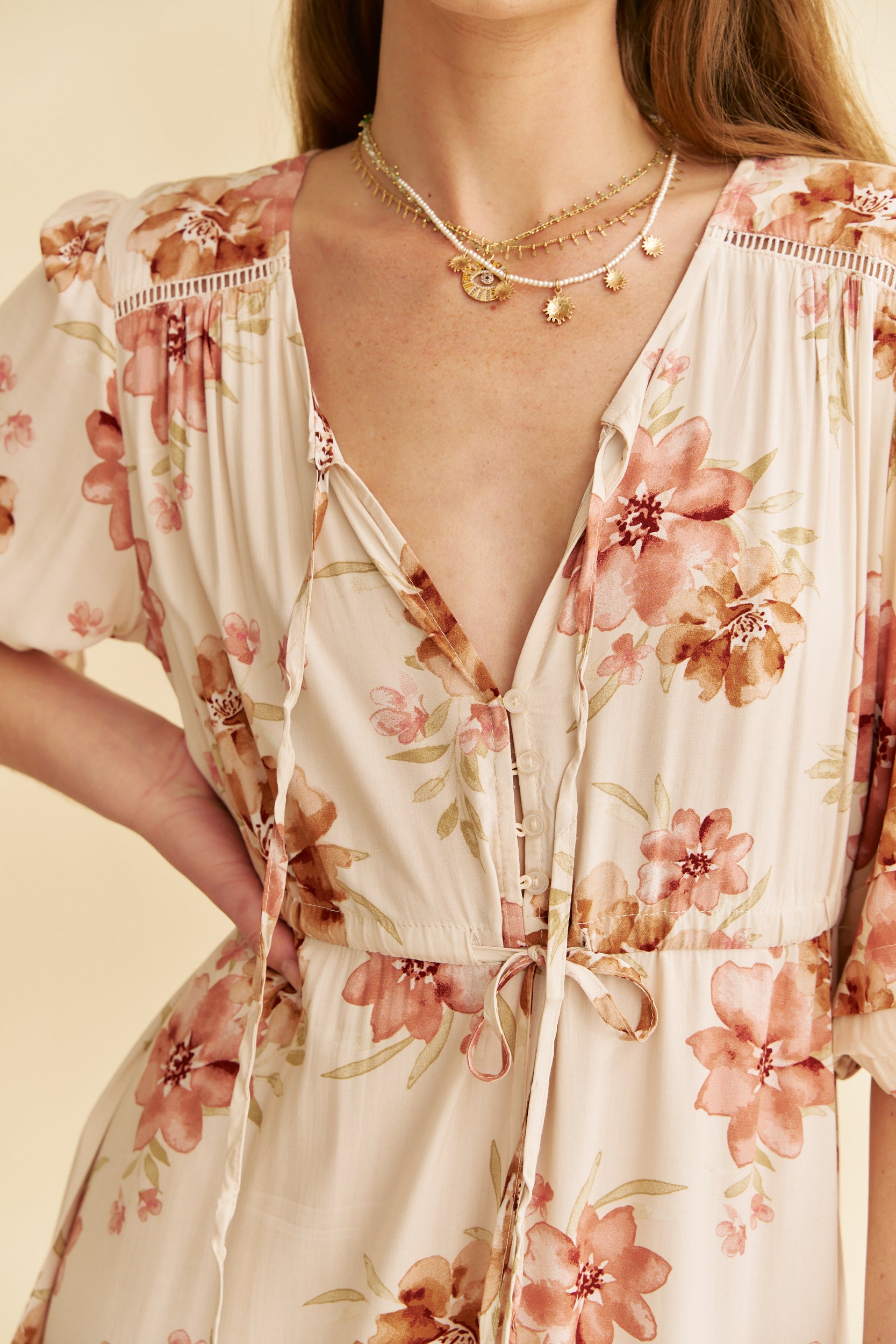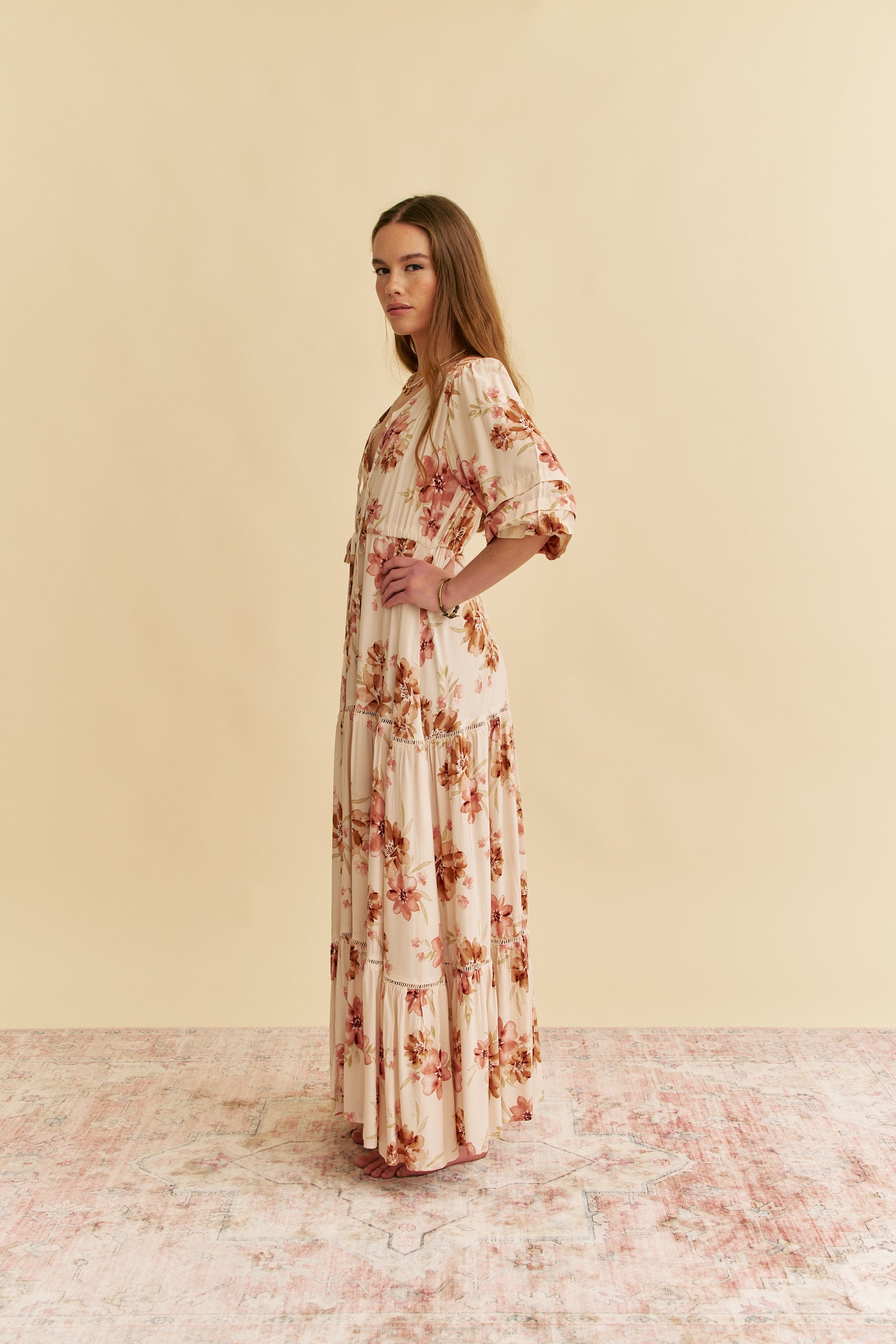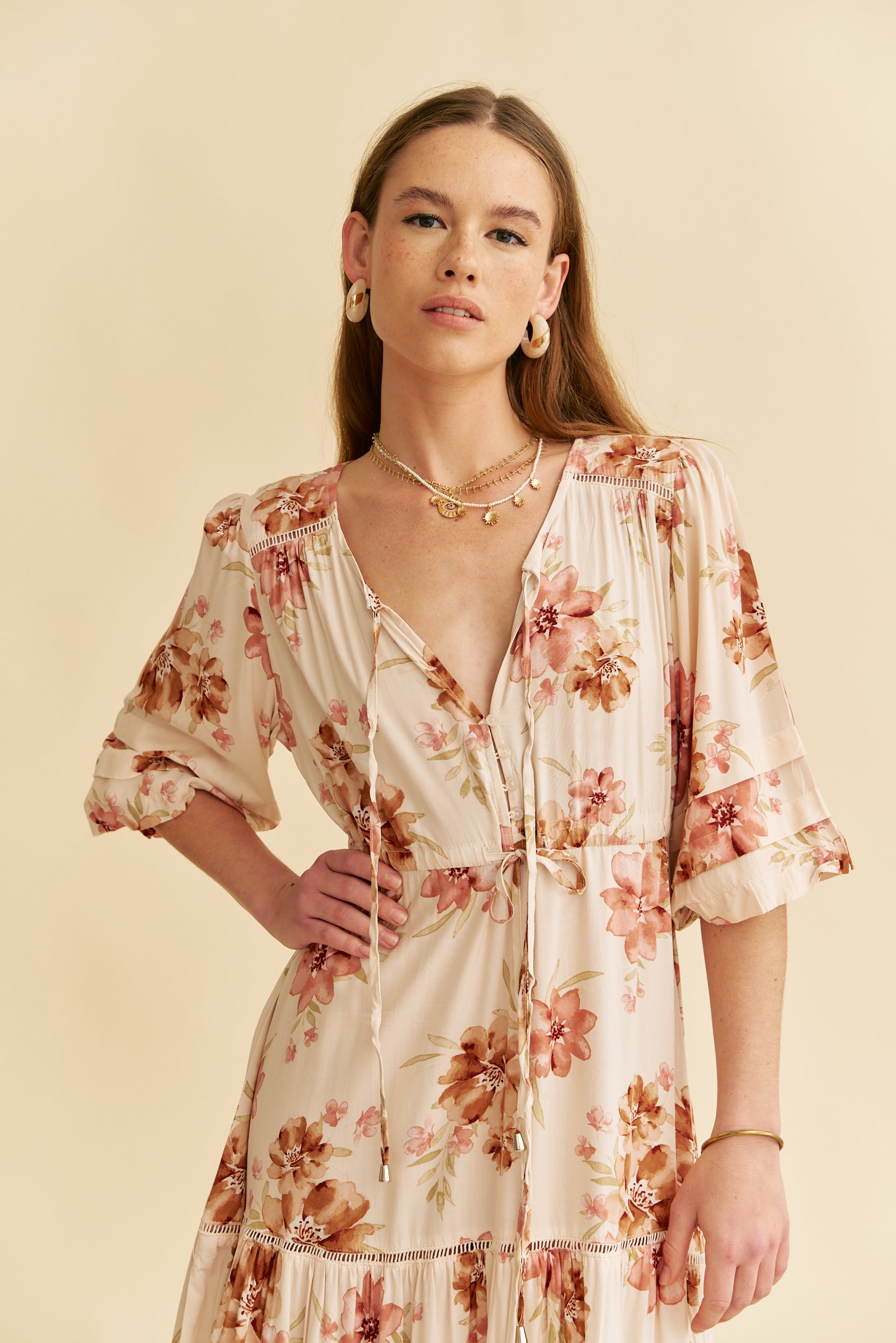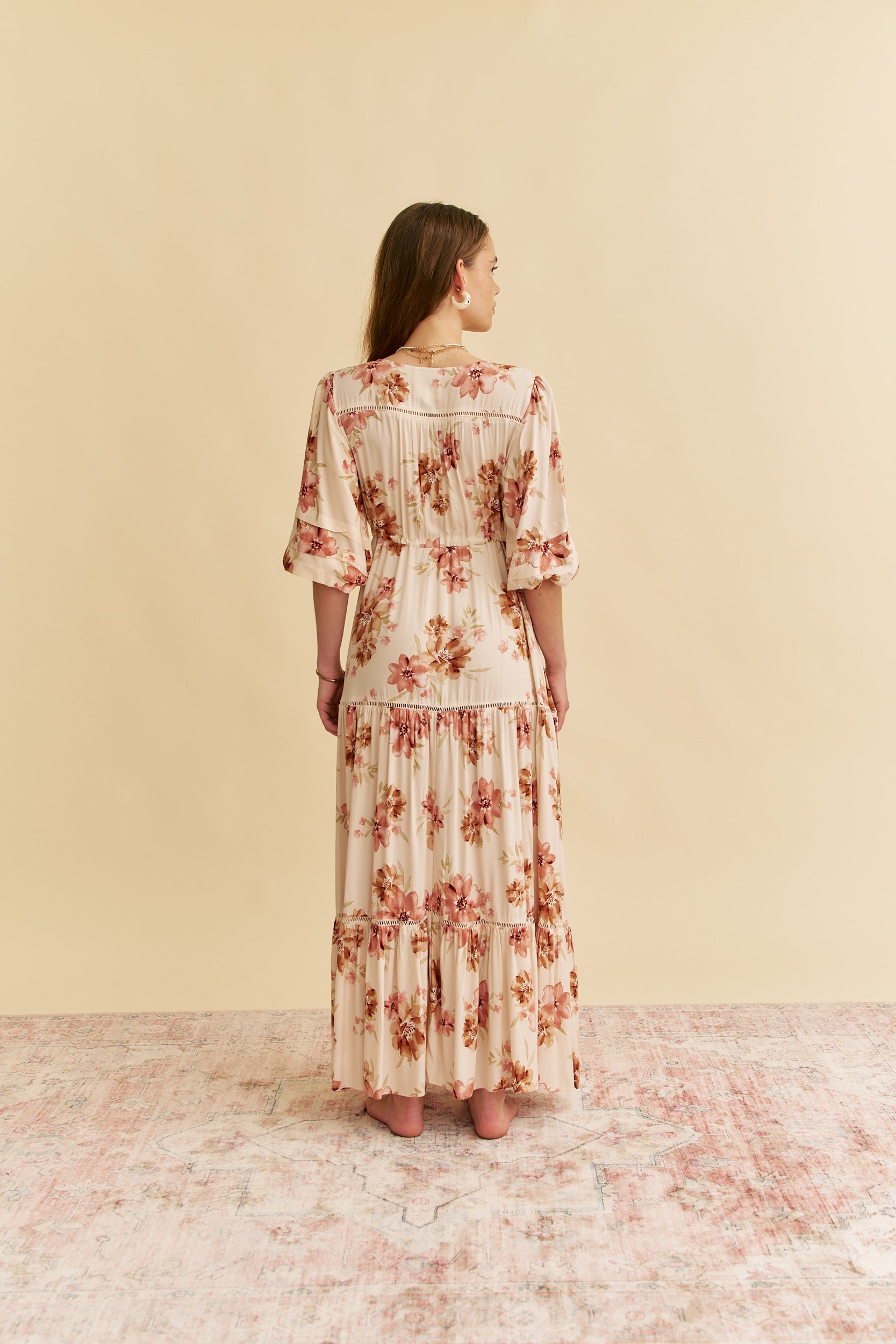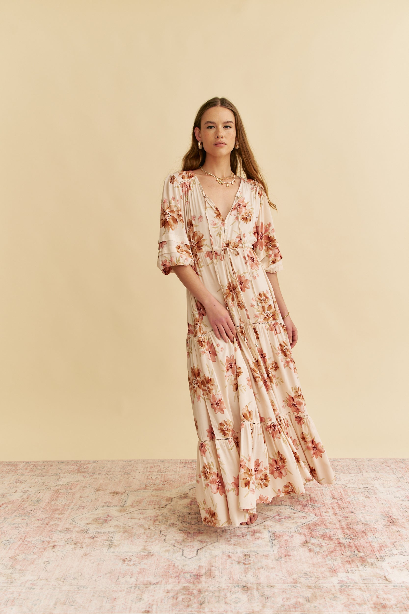 So romantic and ready-for-anything, this stunning dress is featured in a three quarter sleeved silhouette with a triple pleating detail. The Mariana is a twist on the classic Jaase drawstring waist and a femme touch with lace trim across shoulder, if you love a Tessa you will love this maxi!