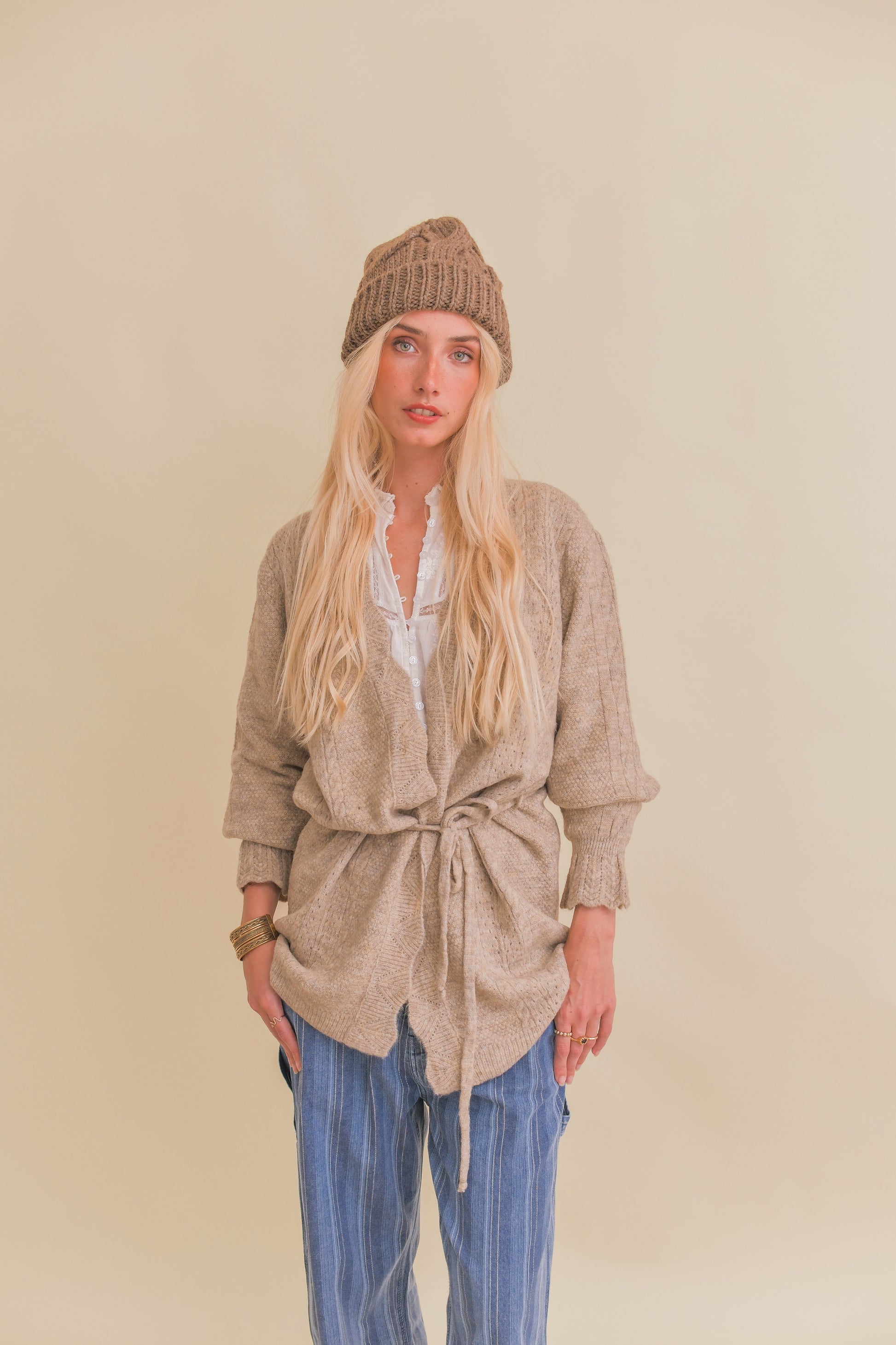 The Jaase Sand Knit, the ultimate laid-back layer for cooler days. This wrap-style cardigan features a soft textured knit with a self-tie waist and relaxed sleeves, blending comfort and elegance in perfect balance.