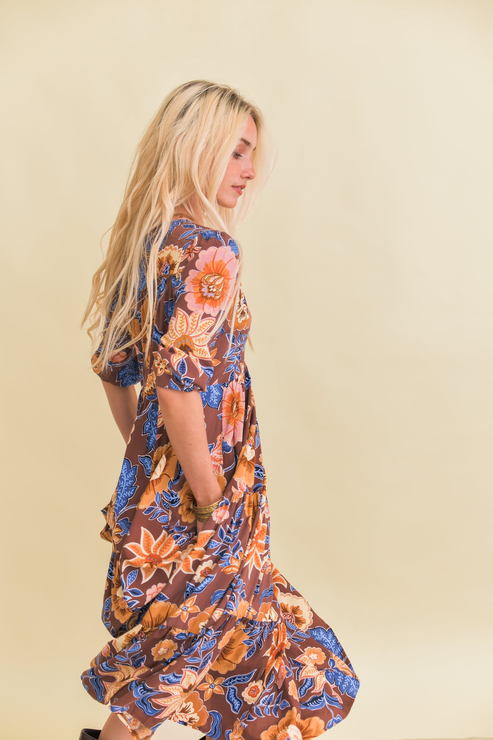 The Jaase Eve Midi Dress with a beautiful V-neck, gorgeous tiered skirt, and playful button-up bust, this boho dress is perfect for any occasion. Plus, the removable waist tie and elasticated arm cuff add both style and comfort.